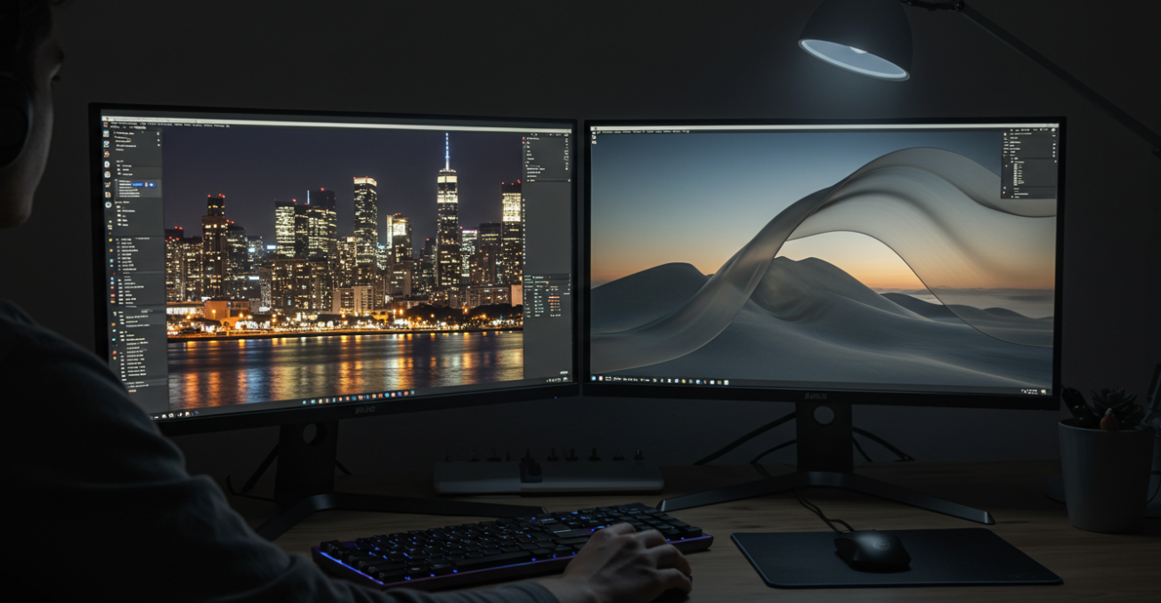 파노라마처럼 길게 촬영된 이미지나 특별히 제작된 듀얼모니터용 배경화면을 사용하면 두 화면이 하나로 이어진 듯한 인상적인 효과를 얻을 수 있습니다.
