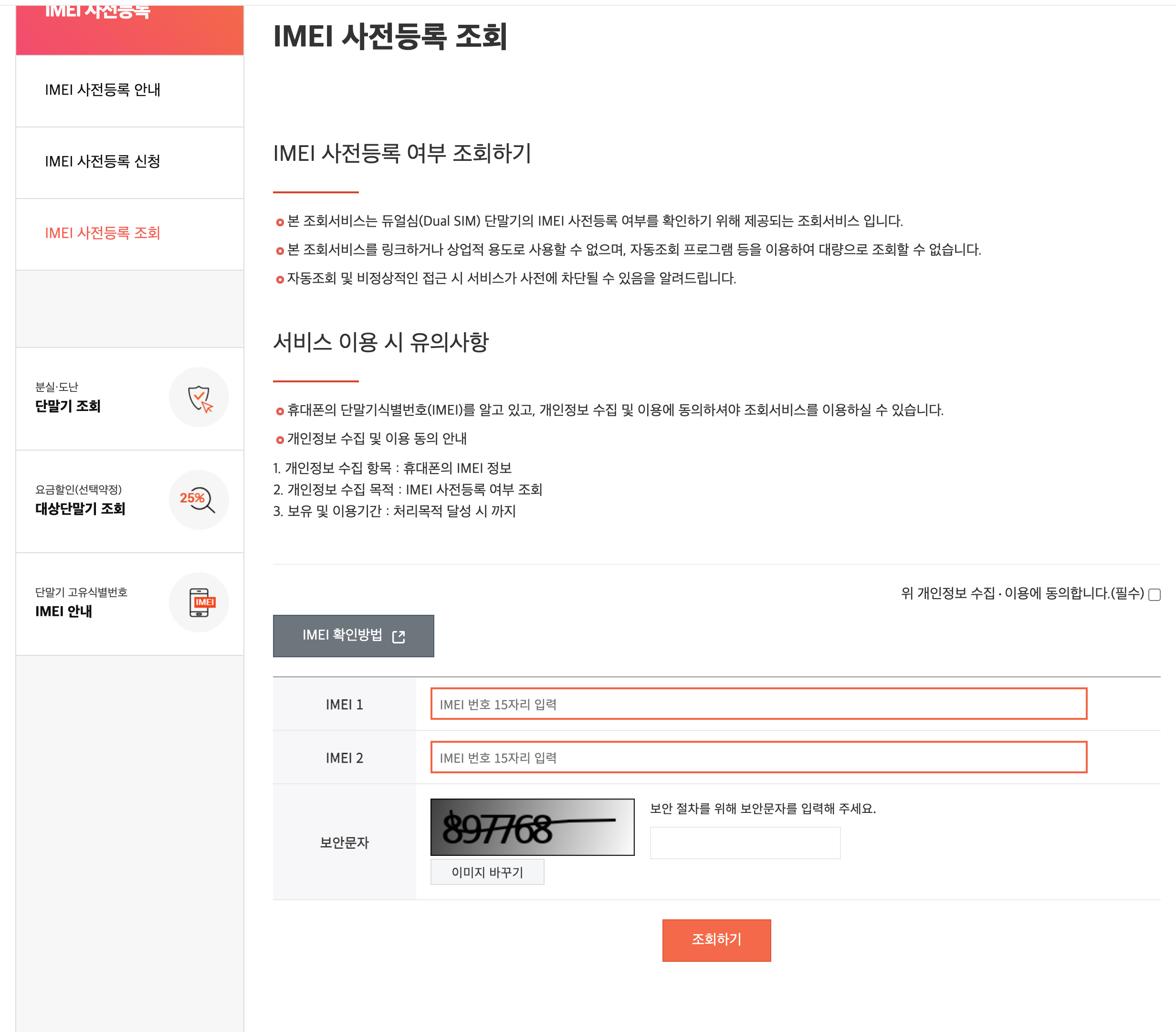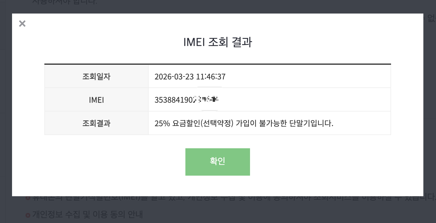 4.듀얼심 폰의 경우 IMEI 2번도 조회 (선택): 듀얼심 폰의 경우, IMEI 2번도 동일하게 조회하여 "25% 요금할인 가입 가능" 메시지가 뜨는지 확인하면 더욱 확실합니다.