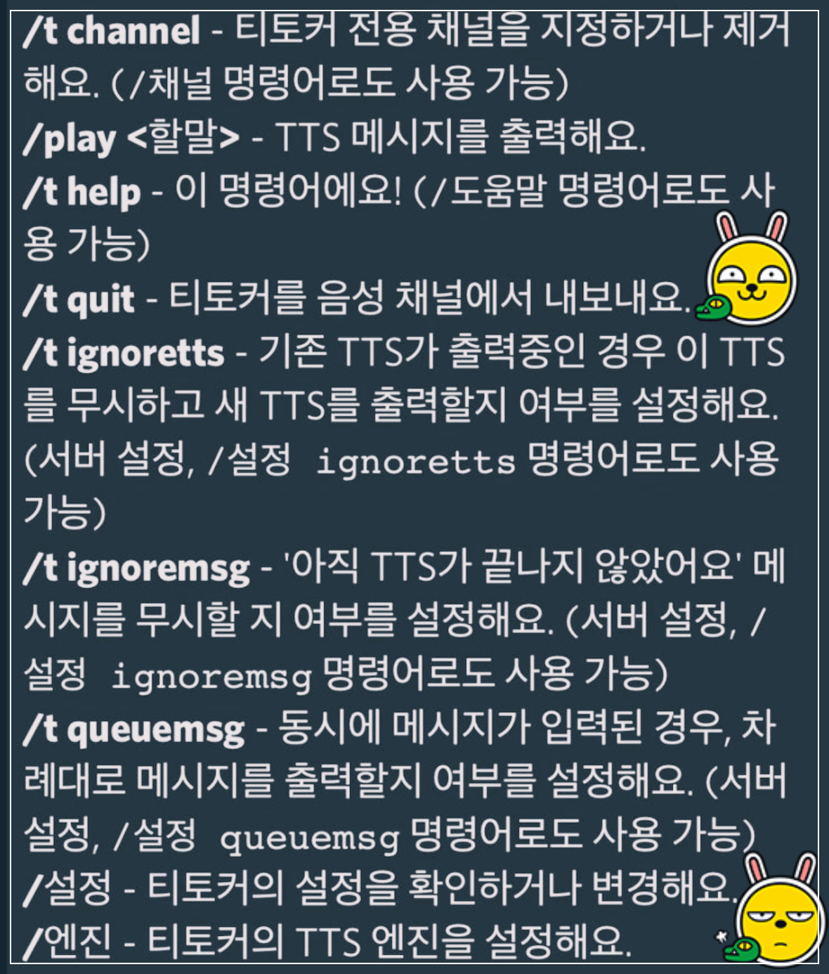 예를 들어, `/t ignoretts` 명령어를 사용하면 이미 진행 중인 TTS를 무시하고 새 메시지를 우선적으로 읽어줄 수 있습니다.