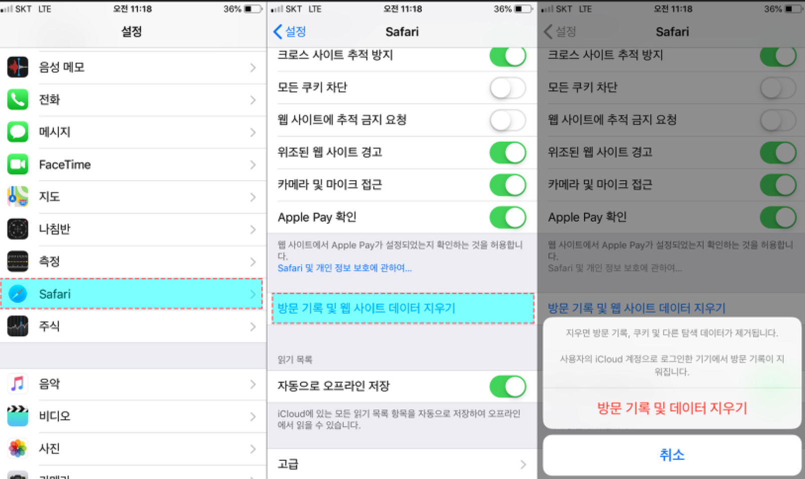 '설정'에서 '사파리'로 들어가 '방문 기록 및 웹사이트 데이터 지우기'를 선택하면 간단하게 해결할 수 있습니다.
