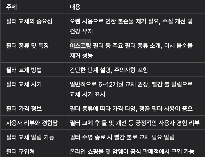사용자가 필터 교체의 필요성을 이해하고 올바른 방법으로 교체할 때, 정수기는 최상의 성능을 발휘할 수 있습니다.