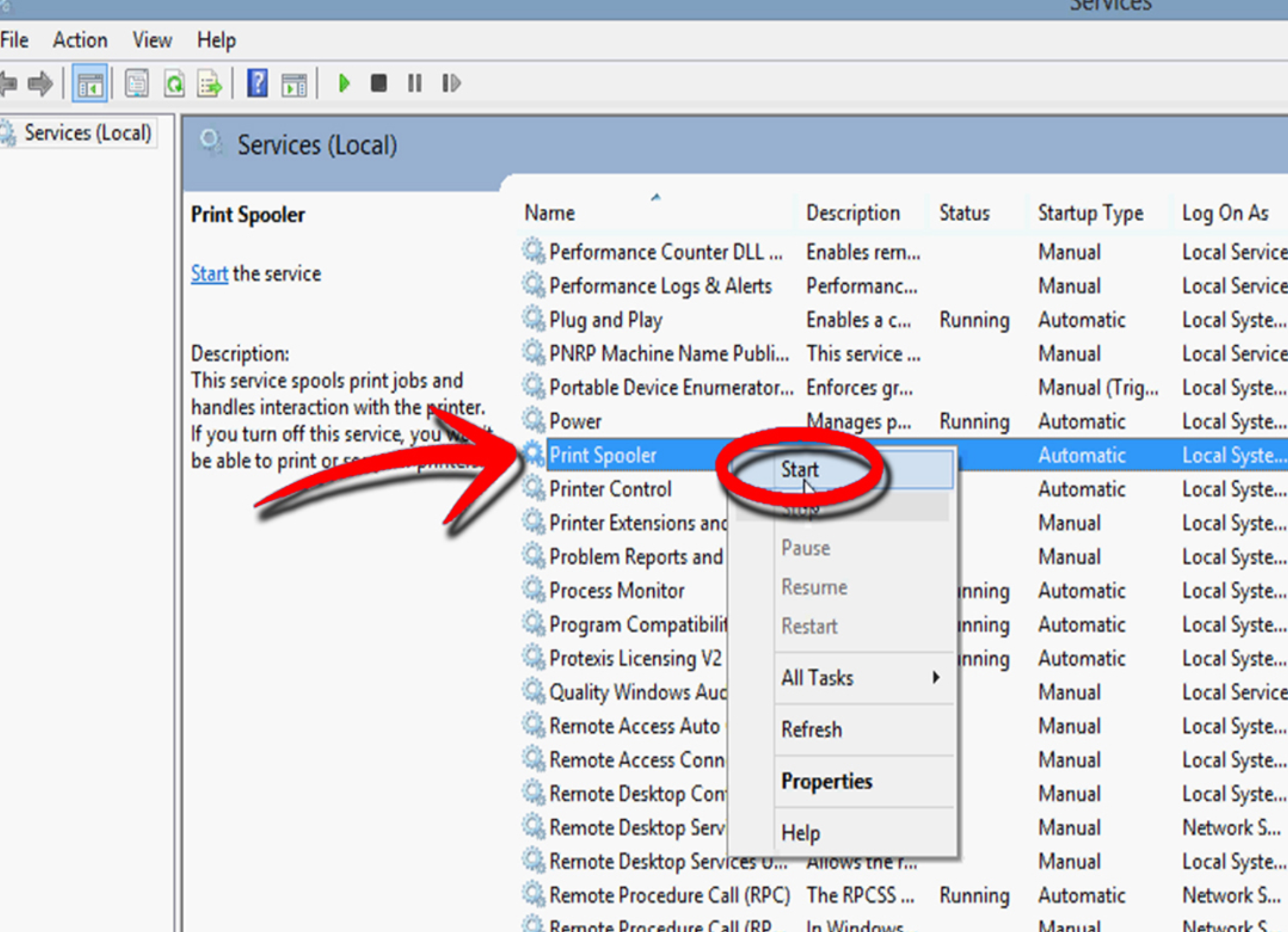 '서비스'에서 '프린트 스풀러' 서비스를 찾아 '중지'를 클릭한 다음, 몇 초 후에 '시작'을 클릭하여 서비스를 다시 시작합니다.