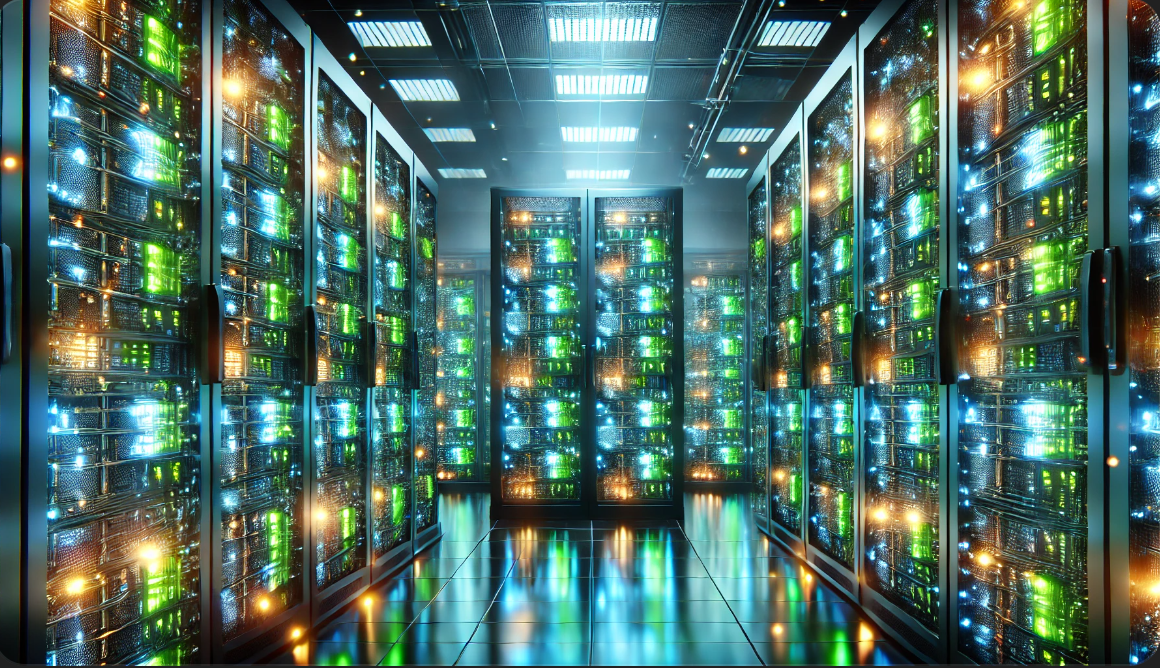 서버 랙과 발광 LED 라이트가 가득한 첨단 서버룸.